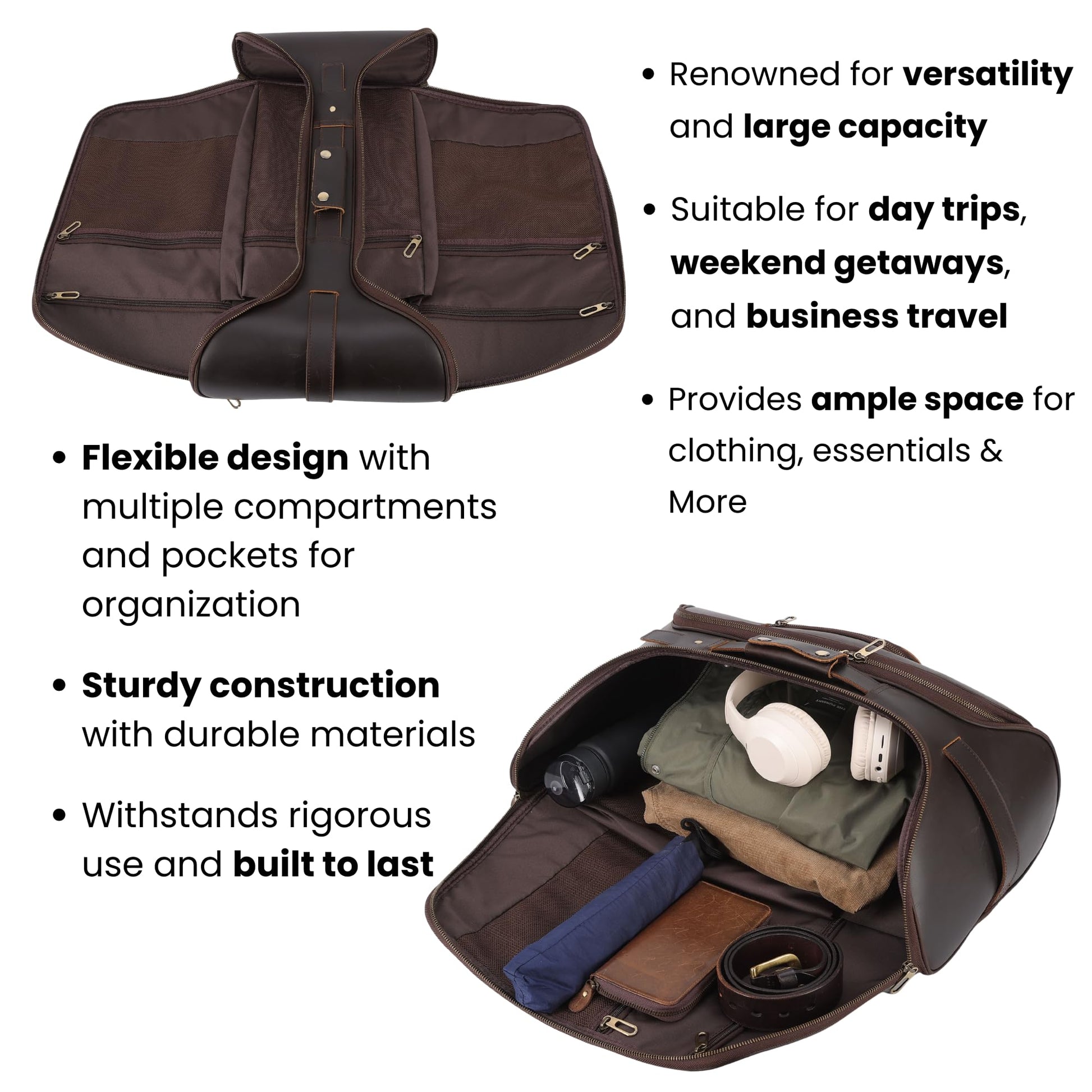 - 2-in-1 CONVERTIBLE DESIGN – Use as a leather duffel bag or convert into a backpack in seconds. Perfect for versatile travel needs from airport terminals to hiking trails.